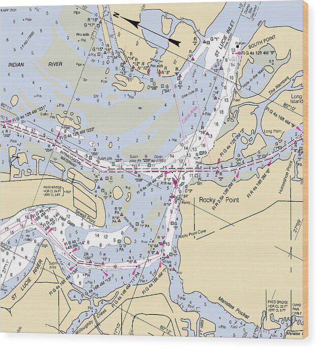 St Lucie Inlet-florida Nautical Chart #1 wood print by Bret Johnstad. Bring your artwork to life with the texture and added depth of a wood print. Your image gets printed directly onto a sheet of 3/4" thick maple wood. There are D-clips on the back of the print for mounting it to your wall using mounting hooks and nails (included).